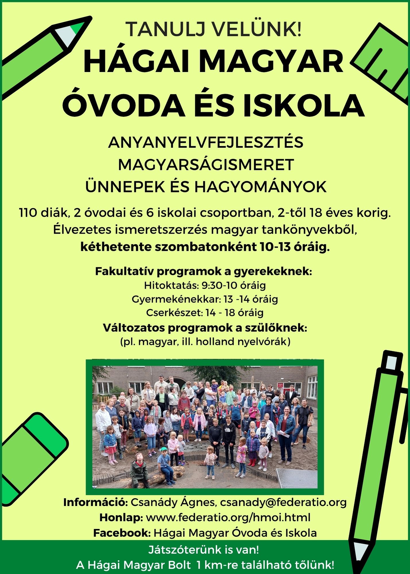 A magyar óvoda / iskola foglalkozásai után 13 órától 14 óráig fakultatív alapon Bornai Szilveszter, zenész, zenetanár, karvezető a tizenéveseknek és Baranyai Virág, énekművész, zeneakadémista a kisebb gyerekeknek gyermekkari próbákat tart. Szeretettel várják minden gyermek jelentkezését, aki énekelni szeretne a Gyermekkórusban. (Bornai Szilveszter a Hágai Magyar Énekkar új karnagya és művészeti vezetője is. A felnőttek jelentkezését is várja a felnőtt énekkarba.) |